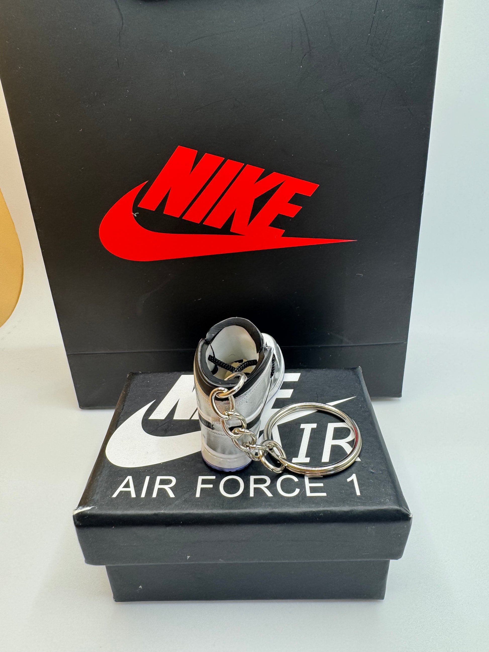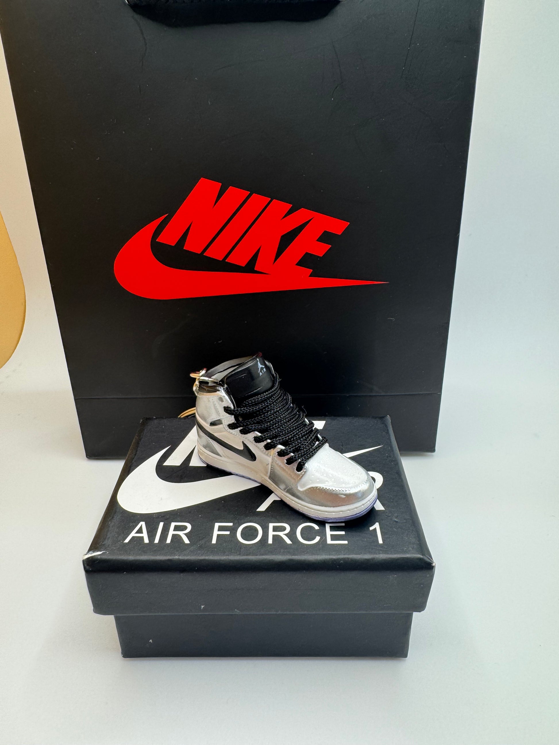 Glänzender Mini Jordan 1 in Silber als Schlüsselanhänger. Stylisches Sammlerstück für echte Sneaker-Fans – auffällig und einzigartig.